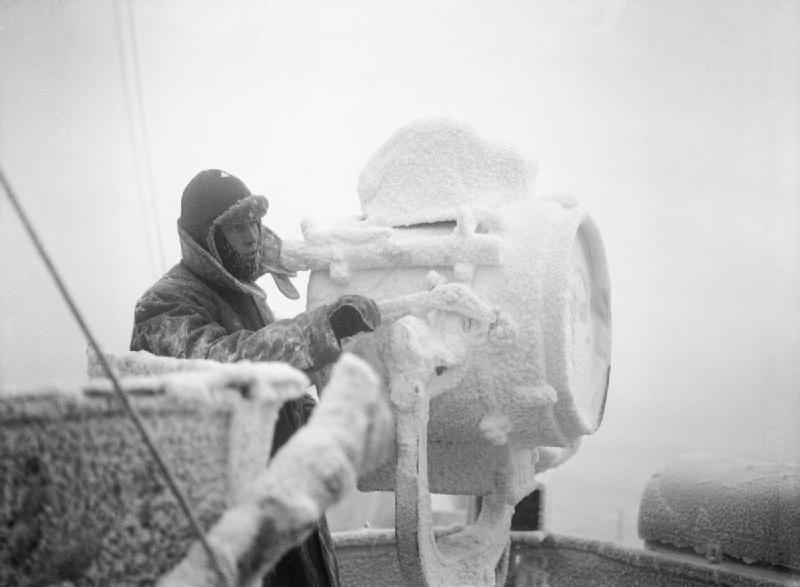 Ghiaccio formatosi su di un proiettore per segnali a bordo dell’incrociatore pesante britannico Sheffield, durante la scorta di uno dei convogli diretti in Unione Sovietica (Imperial War Museum)